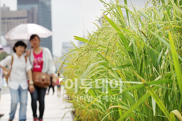 국지성 호우가 주춤하고 전국적으로 무더위가 다시 기승을 부리는 17일 오후 서울 광화문광장에 벼가 고개를 숙이며 익어가고 있다.