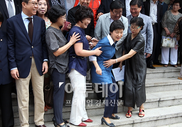 박근혜 새누리당 후보가 19일 오전 서울 영등포구청에서 대통령 선거 후보자 경선 선거인단 투표를 마친 후 기념촬영을 위해 서있던 계단에서 발을 헛딛고 휘청이고 있다.