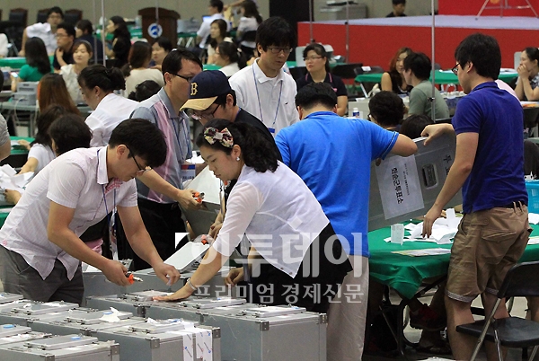 새누리당 18대 대통령 선거 후보자 지명 전당대회가 20일 오전 고양시 일산 킨텍스 제1전시장에서 열린다. 이날 오전 관계자들이 투표함을 개봉하고 있다. 20만명의 국민참여선거인단 투표 결과와 6천명에 대한 여론조사 결과를 합산해 결정되는 대선후보는 오늘 오후 발표될 예정이다.