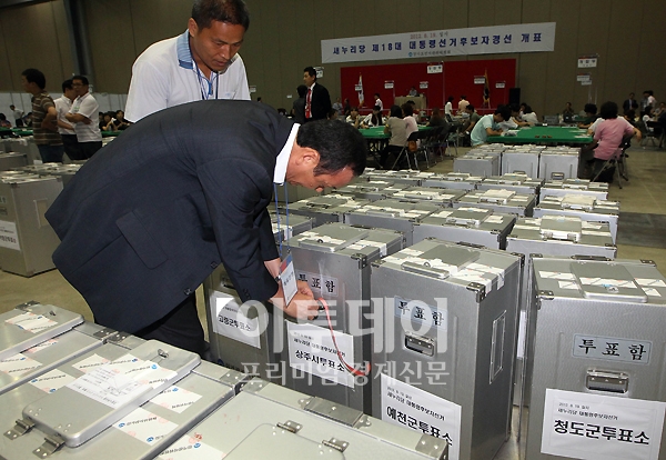 새누리당 18대 대통령 선거 후보자 지명 전당대회가 20일 오전 고양시 일산 킨텍스 제1전시장에서 열린다. 이날 오전 관계자들이 투표함 개봉 준비를 하고 있다. 20만명의 국민참여선거인단 투표 결과와 6천명에 대한 여론조사 결과를 합산해 결정되는 대선후보는 오늘 오후 발표될 예정이다.