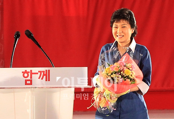 박근혜 새누리당 후보가 20일 오후 경기 고양시 일산 킨텍스에서 열린 새누리당 제18대 대통령 선거 후보자 지명 전당대회에서 대선후보로 선출됐다. 박근혜 후보가 꽃다발을 들고 환하게 웃고 있다.