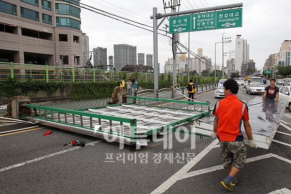 제15호 태풍 ‘볼라벤’이 수도권에 영향을 미치고 있는 28일 오후 서울 용산구 한강대교 북단 사거리에서 대형 광고판이 강풍에 쓰러져 있다.