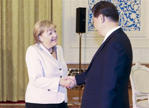 앙겔라 메르켈(왼쪽) 독일 총리가 30일(현지시간) 베이징에서 시진핑 중국 국가부주석을 만나 악수하고 있다. 메르켈 총리는 이날 앞서 원자바오 중국 총리와 회담하고 공동기자회견을 열었다. 원자바오 총리는 유럽연합(EU) 국채 투자를 지속하겠다는 입장을 밝혔다. 베이징/신화연합뉴스