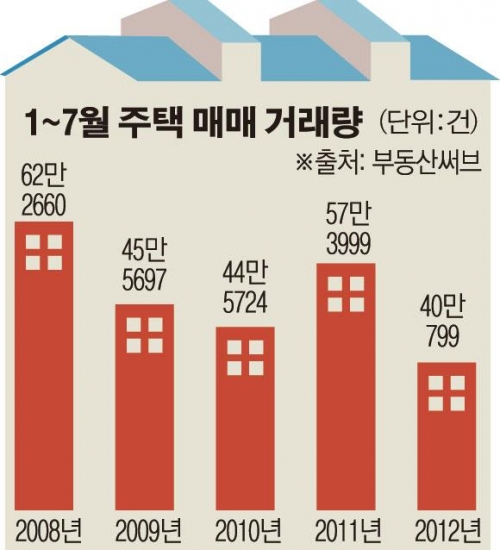 4일 부동산정보업체 부동산써브에 따르면 2006~2012년(매년1~7월) 기간의 주택 거래(매매)량을 분석한 결과, 올 1~7월 전국적으로 40만799건을 기록해 국토해양부가 실거래(매매)량을 집계·발표한 2006년 이후 최저치를 기록했다. 지난해 동기 57만3999건과 비교해도 30.2%나 급감한 수치다.