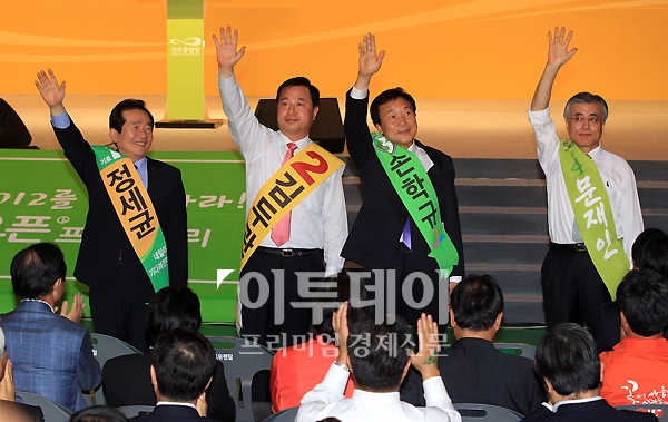 문재인, 손학규, 김두관, 정세균 후보가 16일 오후 경기 고양시 고양체육관에서 열린 제18대 대통령선거후보자 선출을 위한 서울지역 순회경선에서 정견발표를 마친 후 당원들과 지지자들에게 인사를 하고 있다.