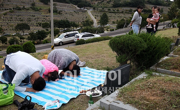 추석을 보름여 앞둔 16일 오후 경기도 파주시 광탄면 용미리 공원묘지에서 한 가족이 성묘를 하고 있다.