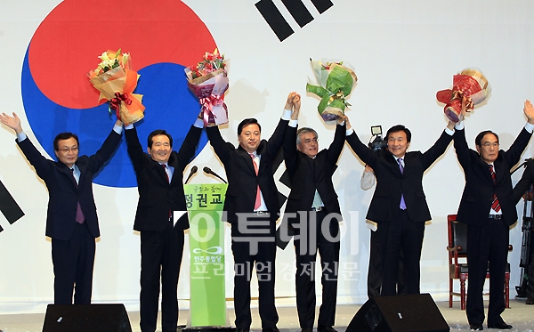 민주통합당의 제18대 대통령선거 후보자가 문재인 후보로 확정됐다. 16일 오후 경기 고양시 고양체육관에서 열린 제18대 대통령선거 후보자 선출을 위한 서울지역 순회경선에서 문재인 민주통합당 대선 후보가 손을 들어 지지자들에게 인사하고 있다. 사진 왼쪽부터 이해찬 대표, 정세균, 김두관, 문재인 대선후보, 손학규, 임채정 당 선관위 의장.