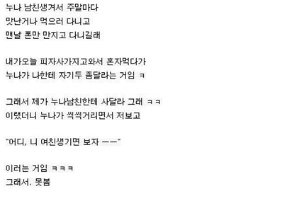 이어서 동생이 "누나 남친한테 사달라고 해"라고 하자, 누나는 "어디 니 여친생기면 보자"라고 답한다.