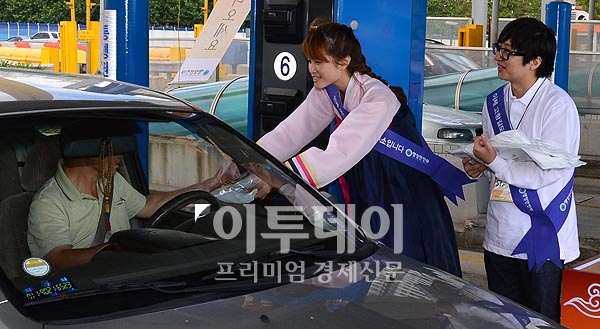 본격적인 추석 귀성행렬이 시작된 29일 오후 성남 궁내동 서울요금소에서 한복을 곱게 차려입은 한국도로공사 직원들이 귀성차량 운전자들에게 안전운전 안내책자와 최신 교통지도를 나눠주고 있다.