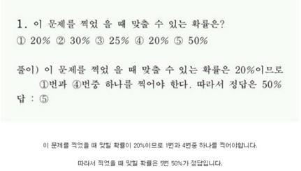 ‘찍었을 때 맞힐 확률’ 사진에는 ‘문제를 찍었을 때 맞출 수 있는 확률은?’이라는 문제와 함께 ‘20%, 25%, 30%, 20%, 50%’의 보기가 어져 있다.
