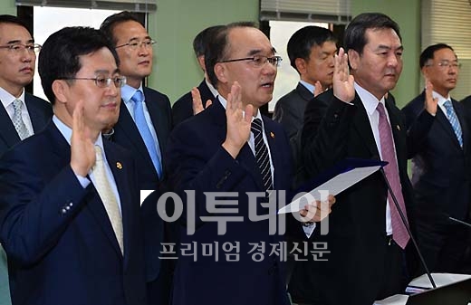 박재완 기획재정부 장관 등 재정부 공무원들이 5일 과천 정부중앙청사에서 국회 기획재정위원회 국정감사를 시작하면서 선서를 하고 있다. 19대 국회의 첫 국정감사는 5일부터 24일까지 20일간 559개 피감기관을 대상으로 실시될 예정이다.