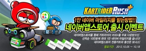 넥슨은 ‘카트라이더 러쉬+’의 네이버 앱스토어 출시를 기념해 네이버 앱스토어에서 ‘카트라이더 러쉬+’를 다운로드 받는 사용자 전원에게 ‘카트라이더 러쉬+’ 네이버앱스토어 전용카트와 풍선을 제공하는 이벤트를 실시한다. 또 네이버 앱스토어에서는 오는 18일 까지 선착순 10만 명에게 최대 1만 네이버 마일리지를 지급하는 이벤트도 진행된다.