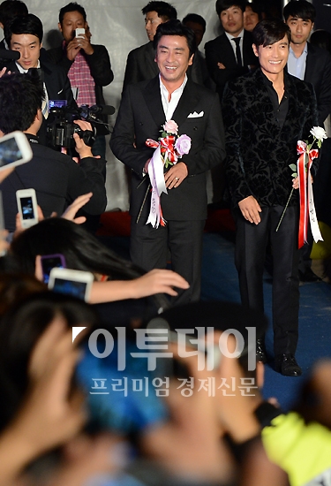 영화배우 이병헌과 류승룡이 5일 오후 부산 해운대 BIFF 빌리지에서 열린 제17회 APAN 스타로드 블루카펫 행사에서 팬들의 환영을 받으며 입장하고 있다.