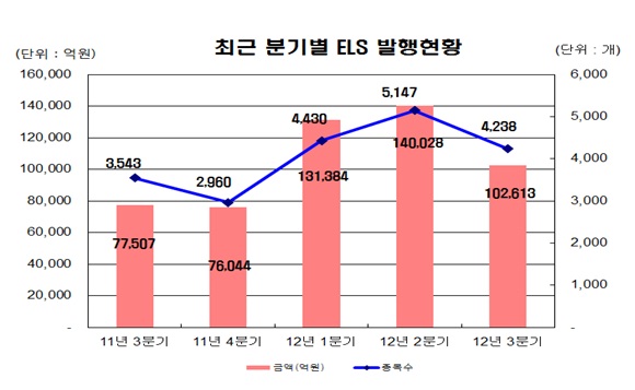 이번 3분기 ELS 발행액은 지난해 동기 대비 7조7507억원과 비교해서는 32.4% 증가했으며 세분기 연속 10조원을 넘어선 금액이다.