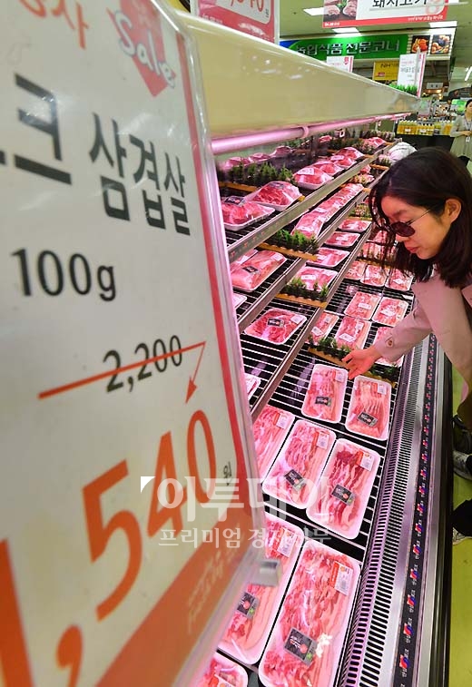 최근 돼지고기값이 올초 가격보다 절반 이하로 떨어진 가운데 8일 양재 하나로클럽 축산물 코너에서 시민들이 삼겹살을 고르고 있다. 유통업계와 축산물품질평가원에 따르면 돼지고기 지육 도매가격은 올 1월 연중 최고가인 5879원보다 절반 이하로 떨어진 2675원으로 나타났으며, 가격 하락은 돼지 사육두수 증가와 경기 불황에 따른 소비 부진 때문으로 파악됐다.