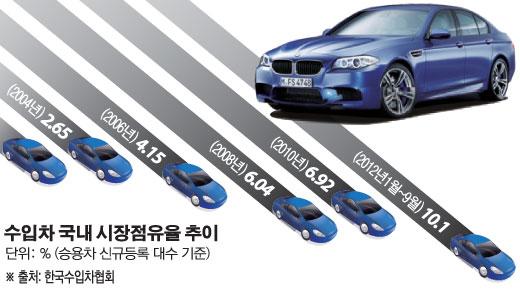 올해 1~9월 수입차는 국내에서 9만5706대가 팔려 10.1%(승용차 기준)의 시장점유율을 기록했다.