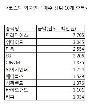 코스닥 외국인 순매수 상위 10개 종목
