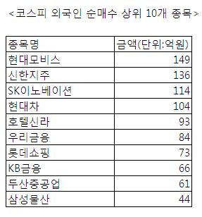 10일 코스피시장 외국인 순매수 상위 10개 종목