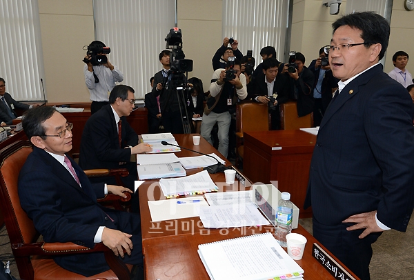 강기정 민주통합당 의원이 11일 오전 여의도 국회 정무위원회에서 열린 공정거래위원회 국정감사에서 김동수 공정위원장이 자료를 내놓지 않자 항의하고 있다.