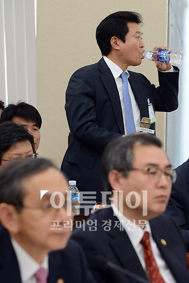 소진세 세븐일레븐 대표가 11일 오전 여의도 국회 정무위원회 공정위 국정감사에서 김영주 민주통합당 의원의 롯데그룹 담배판매권 관련 질문에 답변하며 물을 들이키고 있다.