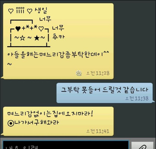 엄마는 생일인 아들에게 케익 이모티콘과 함께 '생일 너무 추가, 아들 올해는 며느리감 좀 부탁한데이'라며 사랑을 듬뿍 담아 문자를 보냈지만, 아들은 생일축하 문자에 고맙다는 말은 커녕, 마지막 문장에 빈정이 상한 듯, "그 부탁 못들어 드릴 것 같습니다"로 응대했다.