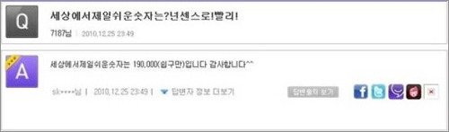 이에 누리꾼들은 숫자 0 혹은 1을 답변으로 가장 많이 선택했다. 하지만 실제 공개된 정답은 ‘190,000(쉽구만)’이었다. 우리말로 숫자를 발음하면 “쉽구만”과 비슷하다는 것이다.