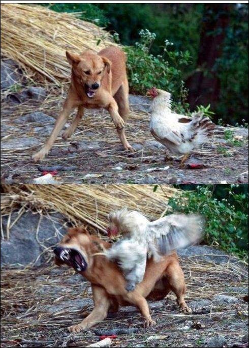 공개된 게시물에는 닭과 개의 모습이 담겨있다. 몹집이 큰 개는 닭을 바라보며 위협적인 자세를 취하고 있다. 하지만 또 다른 사진에서는 닭이 날아 개를 공격하고 개는 닭에게 꼼짝하지 못해 보는 이의 웃음을 자아낸다.