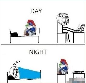 그림은 낮에는 온갖 잡동사니를 침대 위에 두고 컴퓨터를 하지만 밤에는 잡동사니를 책상으로 옮기고 잠을 자는 모습을 표현했다.