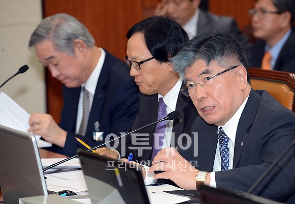 김중수 한국은행 총재가 24일 오전 국회에서 열린 기획재정위 국정감사에 출석해 의원들의 질의에 답변하고 있다.