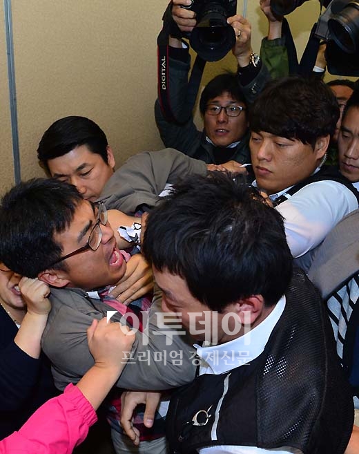 24일 서울 삼성동 코엑스에서 한중일 FTA 공청회가 열린 가운데 한중FTA중단농수축산비대위 회원들이 장내로 들어와 보안요원들과 마찰을 빚고 있다.