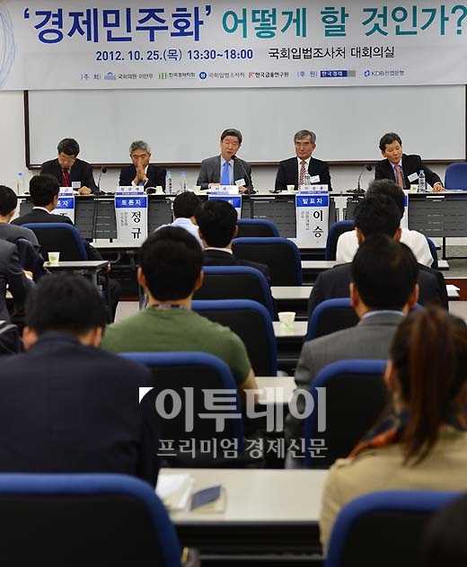 25일 서울 여의도 국회에서 '경제민주화' 어떻게 할 것인가? 토론회가 열린 가운데 이종원 성균관대 경제학 교수가 주제토론을 진행하고 있다.