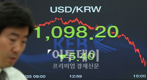 원달러 환율이 1100원 아래로 떨어졌다. 25일 오후 달러당 원화는 5.40원 내린 1098.20에 장을 마쳤다. 원달러 환율이 1100원 아래로 떨어진 것은 13개월여 만이다. 사진은 이날 오후 중구 외환은행 본점 딜링룸.