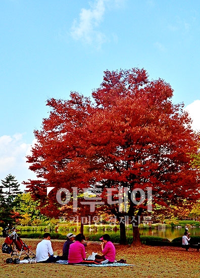 완연한 가을 날씨를 보인 25일 경기도 고양시 일산 호수공원에서 시민들이 가을의 정취를 만끽하고 있다.
