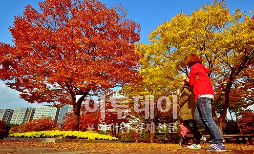 완연한 가을 날씨를 보인 25일 경기도 고양시 일산 호수공원에서 시민들이 떨어진 낙엽을 밟으며 가을의 정취를 만끽하고 있다.