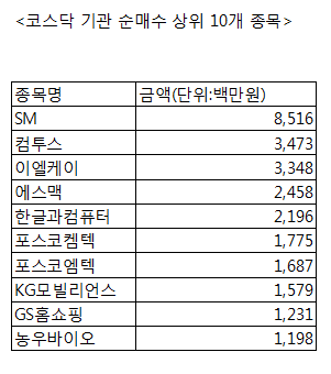 [코스닥 기관 순매수 상위 10개 종목]