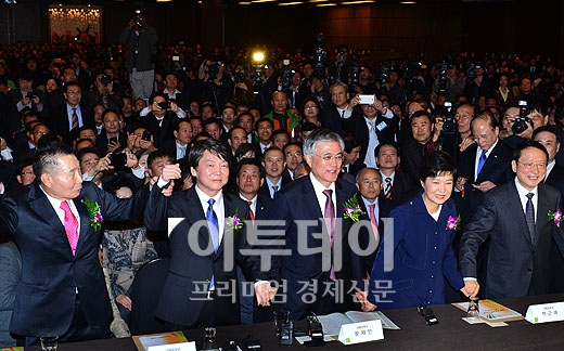 박근혜 새누리당 대선후보와 문재인 민주통합당 대선후보와 안철수 무소속 대선후보가 29일 오후 서울 영등포구 여의도 63시티 그랜드 볼룸에서 열린 '골목상권 살리기 운동 전국대표자대회'에서 주최측이 세 후보에게 손을 들어줄 것을 요청했으나, 안철수 후보만이 손을 들고 있다.