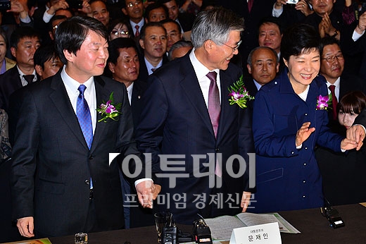 박근혜 새누리당 대선후보와 문재인 민주통합당 대선후보와 안철수 무소속 대선후보가 29일 오후 서울 영등포구 여의도 63시티 그랜드 볼룸에서 열린 '골목상권 살리기 운동 전국대표자대회'에 참석했다. 주최측이 세 후보에게 잡은 손을 들어줄 것을 요청했으나, 박 후보가 쑥스러운 듯 손사래를 치고 있다.