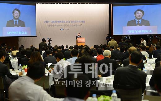 안철수 무소속 대선후보가 30일 서울 중구 대한상공회의소 국제회의실에서 전국 상공인과의 대화를 가졌다. 참석자들이 안철수 후보가 강연을 경청하고 있다. '정치가 바뀌어야 기업이 튼튼해집니다'라는 주제로 열린 이날 간담회에서 안 후보는 사회적 격차 해소, 혁신 경제, 복지 개혁 등의 화두를 참석자들과 함께 나눴다.