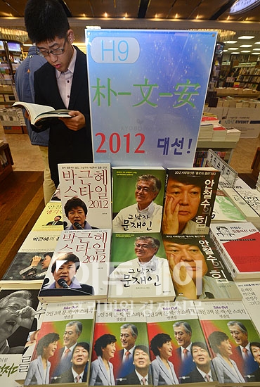 제 18대 대통령 선거를 50일 앞둔 30일 서울 광화문 교보문고에서 한 시민이 진열된 대선주자들의 관련책을 살펴보고 있다.