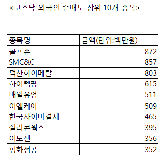 30일 코스닥 외국인 순매도 상위 10개 종목
