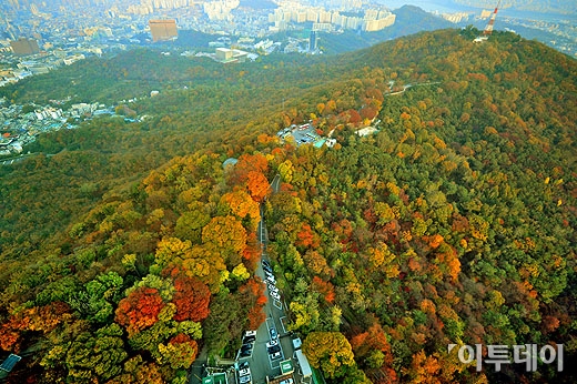 30일 서울 용산구 N타워에서 바라본 남산이 울긋불긋 절정을 이룬 단풍으로 한편의 수채화를 연출하고 있다.