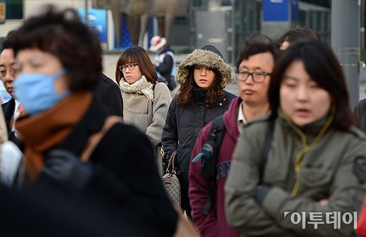 초 겨울 날씨를 보인 31일 오전 서울 광화문네거리에서 시민들이 몸을 움츠린채 출근길을 서두르고 있다.