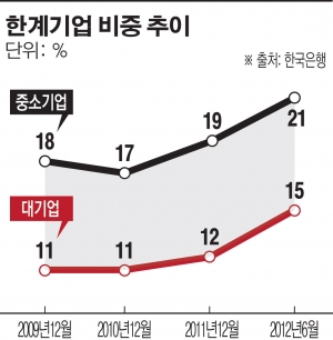 한은 보고서에 따르면 상장기업 가운데 한계기업의 비중은 2010년 말 14%에서 2011년 말 15%, 2012년 6월 말 18%로 크게 증가한 것으로 나타났다. 대기업은 2010년 말 11%였던 것이 2012년 6월 현재 15%로 증가했고, 중소기업도 같은 기간 17%에서 21%로 늘어났다.