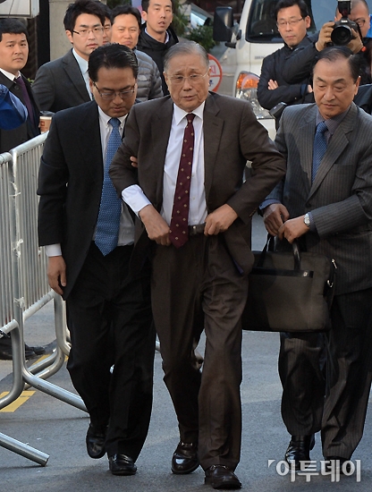 이명박 대통령의 큰형인 이상은 다스 회장이 1일 오전 중요 참고인으로 특검에 소환돼 서초동 특검사무실에 들어서고 있다. 특검팀은 이 회장을 상대로 조카 시형씨에게 현금 6억원을 빌려준 경위와 돈의 출처 등을 조사할 예정이다.