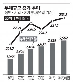 작년 말 부채 합계는 2859조원으로 GDP의 231.1%이었다. 반년만에 주요 경제 주체들의 부채 합계가 103조원 가량 증가한 것이다. 부채 합계는 2007년말 1966조원으로 2000조원에 못 미쳤으나 2008년말 2263조, 2009년말 2434조, 2010년말 2631조원으로 증가했다.