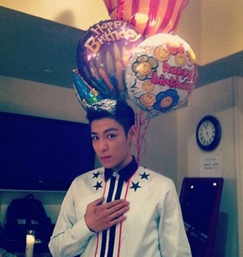 사진 속 TOP은 별무늬와 스트라이프가 그려진 셔츠를 입고 등에 풍선을 매단 채 포즈를 취하고 있다. 특히 등 뒤에 매단 풍선에는 'Happy birthday'라는 문구가 씌여져있어 생일 파티 분위기를 연출하고 있다.