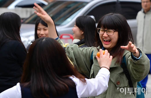 2013학년도 대학수학능력시험이 실시된 8일 오전 서울 용산구 성심여고에서 응시생들이 후배들의 응원을 받으며 시험장으로 들어가고 있다. 이날 수능은 전국 85개 시험지구 1191개 시험장에서 일제히 실시됐으며 작년보다 2만 5000여명 줄어든 66만 여명의 학생들이 응시했다.