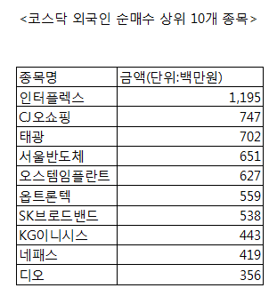 8일 코스닥 외국인 순매수 상위 10개 종목