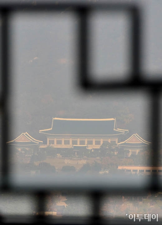 사상 첫 청와대 압수수색을 초읽기에 둔 12일 서울 중구의 한 호텔 조형물 너머 바라본 청와대의 모습에 묘한 긴장감이 흐르고 있다.