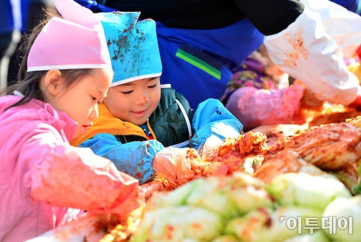 13일 서울 하나로클럽 양재점에서 열린 '사랑의 김장나누기'행사에서 아이들이 김치소를 버무리고 있다.
